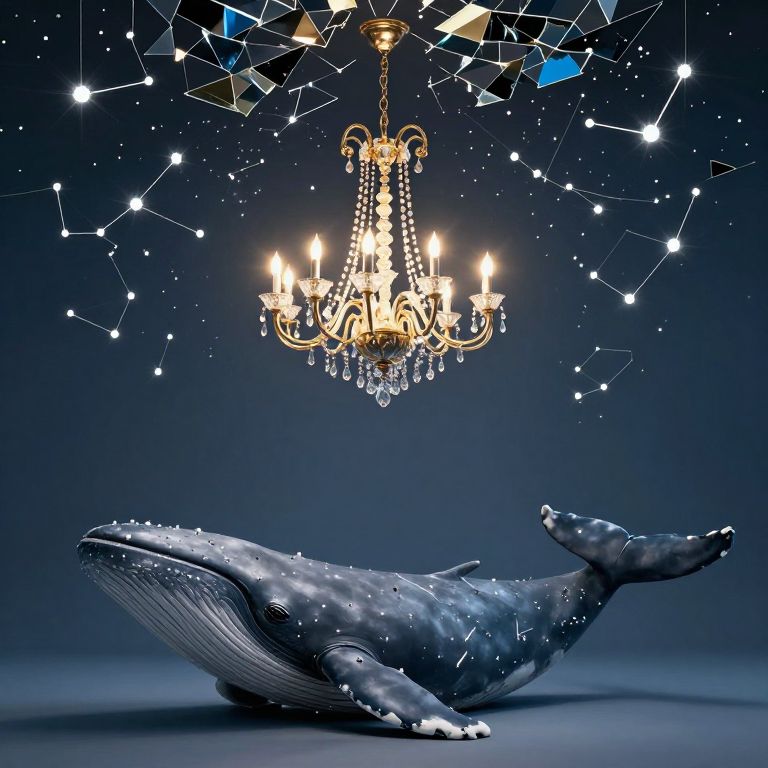 A talking chandelier leads a philosophical debate with a silent whale beneath a sky made of shattered mirrored constellations.