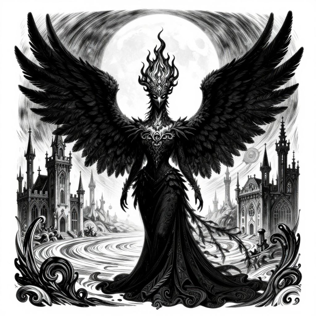 High-detail gothic illustration of a phoenix-inspired figure with large black wings, elaborate headpiece resembling flames, and a long flowing dark dress. The black and white artwork features intricate architectural elements reminiscent of gothic castles and a swirling, stylized landscape under a large full moon, showcasing influences from Edward Gorey and Tim Burton with pop art elements.