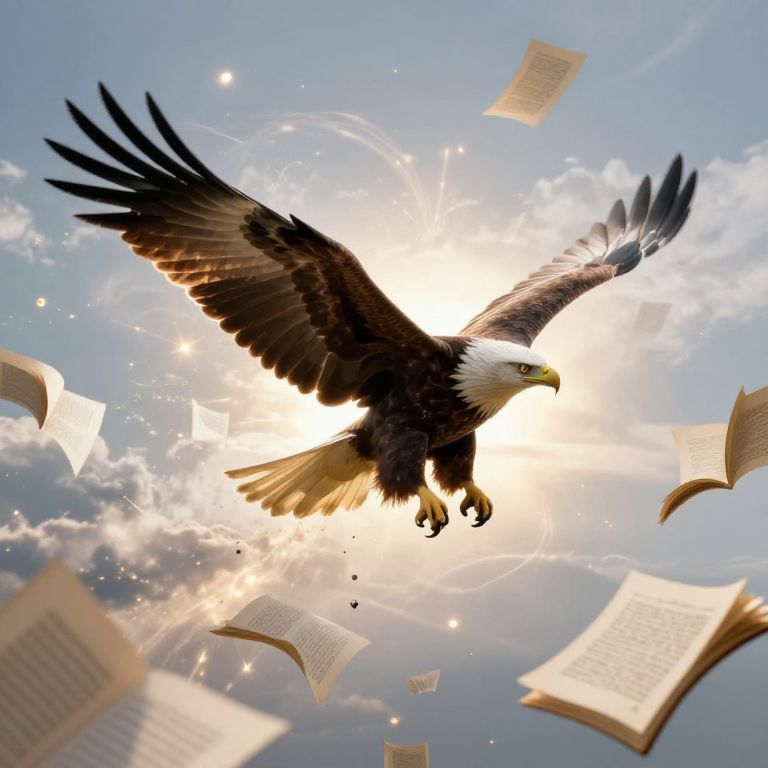 Photograph-like digital illustration of a majestic bald eagle with dark brown feathers and a white head, soaring through a bright, sunlit sky. The eagle's wings are fully spread, showcasing detailed feathers. Surrounding the eagle are floating, open books with visible text, illuminated by sunlight filtering through scattered clouds. The sky is a gradient of blue and white, with sparkles and light flares enhancing the ethereal atmosphere. The eagle's intense yellow eyes and sharp talons are prominently visible, adding a sense of power and grace to the composition.