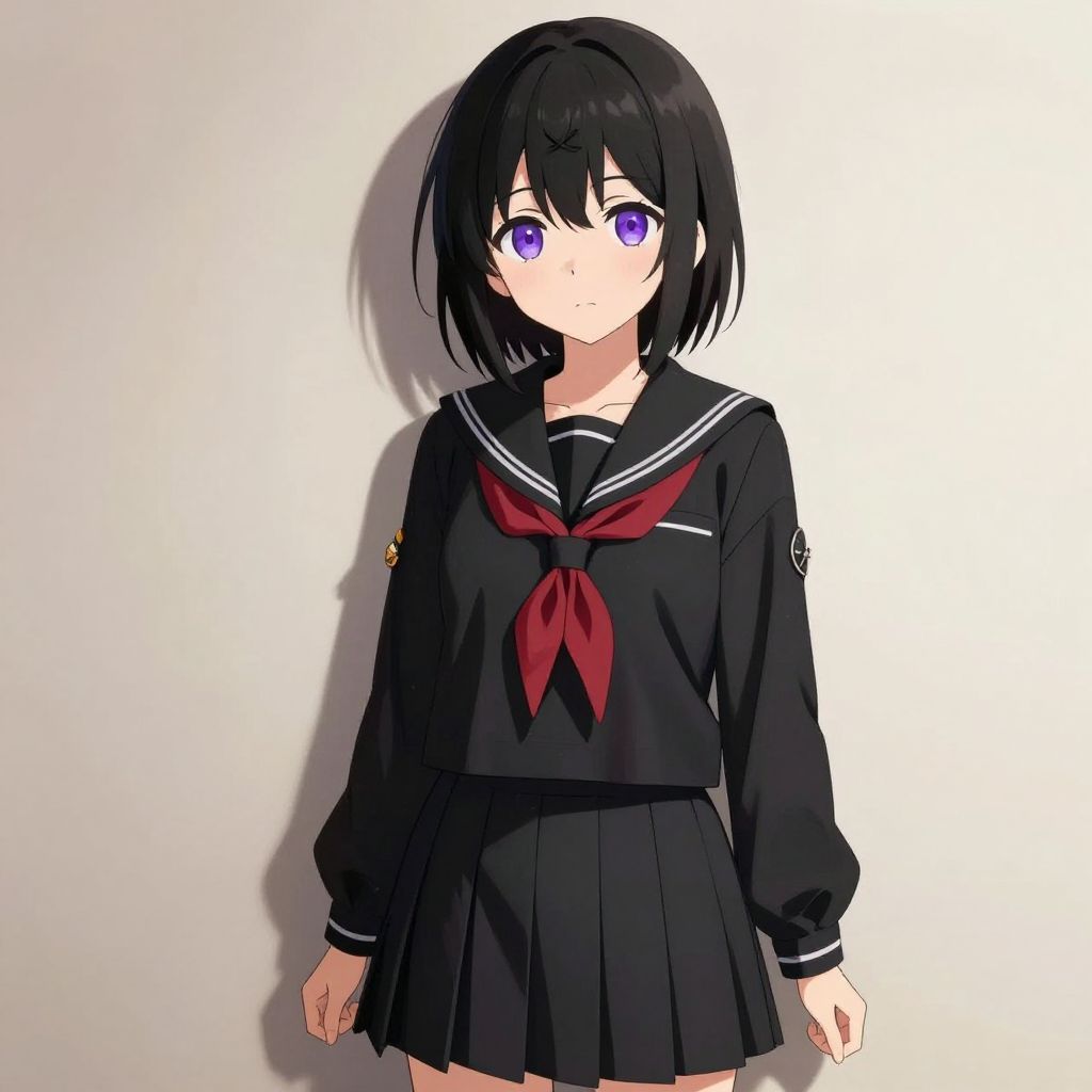 Evil anime girl smile, pale skin contrasted with radiant crimson eyes, long black hair swept back, wearing a dark school uniform with crimson bow, standing in a spooky abandoned corridor, mysterious and chilling vibe, sharp shadows, high resolution anime artwork