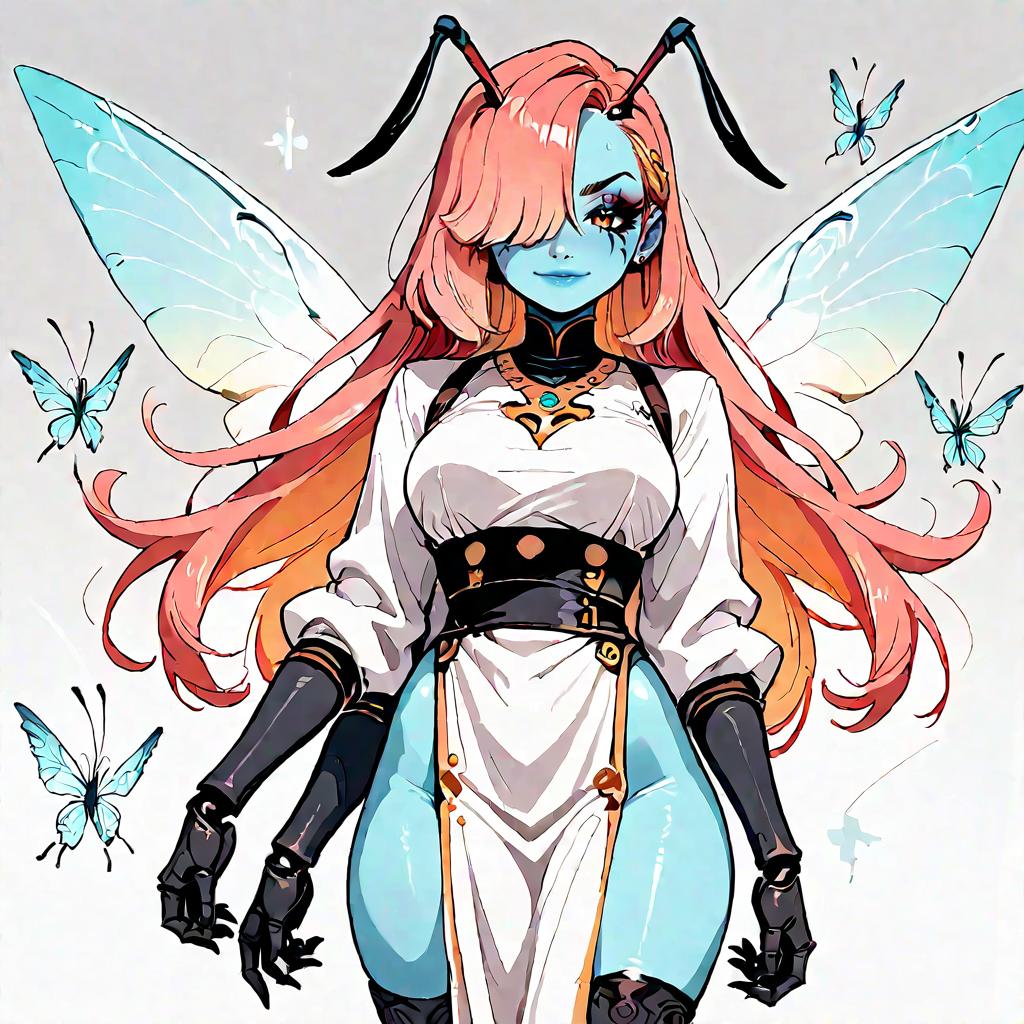 Score_9, score_8_up, score_7_up, source_anime, rating_safe, solo, 1girl, juniperactias, arthropod girl, colored skin, extra arms, smug, looking at viewer, long hair, hair over one eye, antennae, colored sclera, pelvic curtain, wings