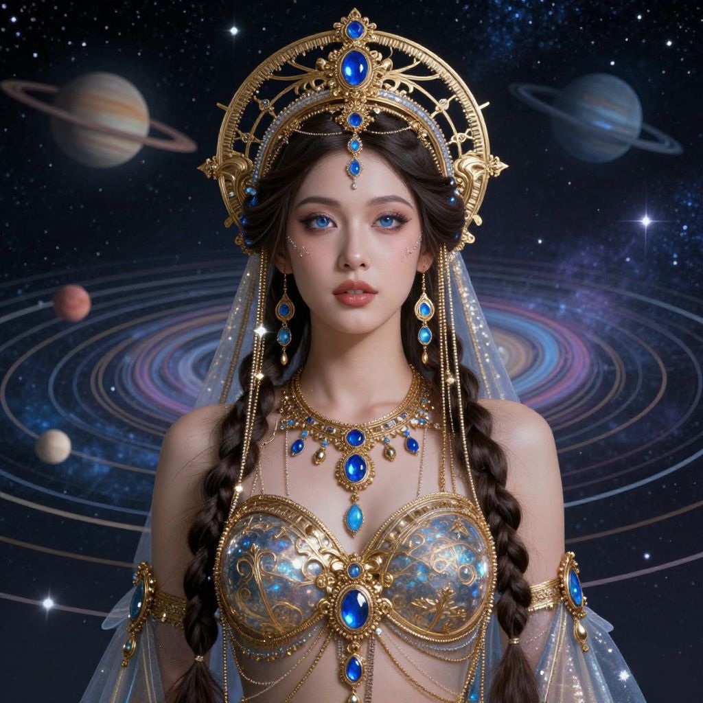 Digital artwork of a beautiful Asian woman with blue eyes, wearing an ornate gold and blue jewelry set, braided hair, and a celestial galaxy background