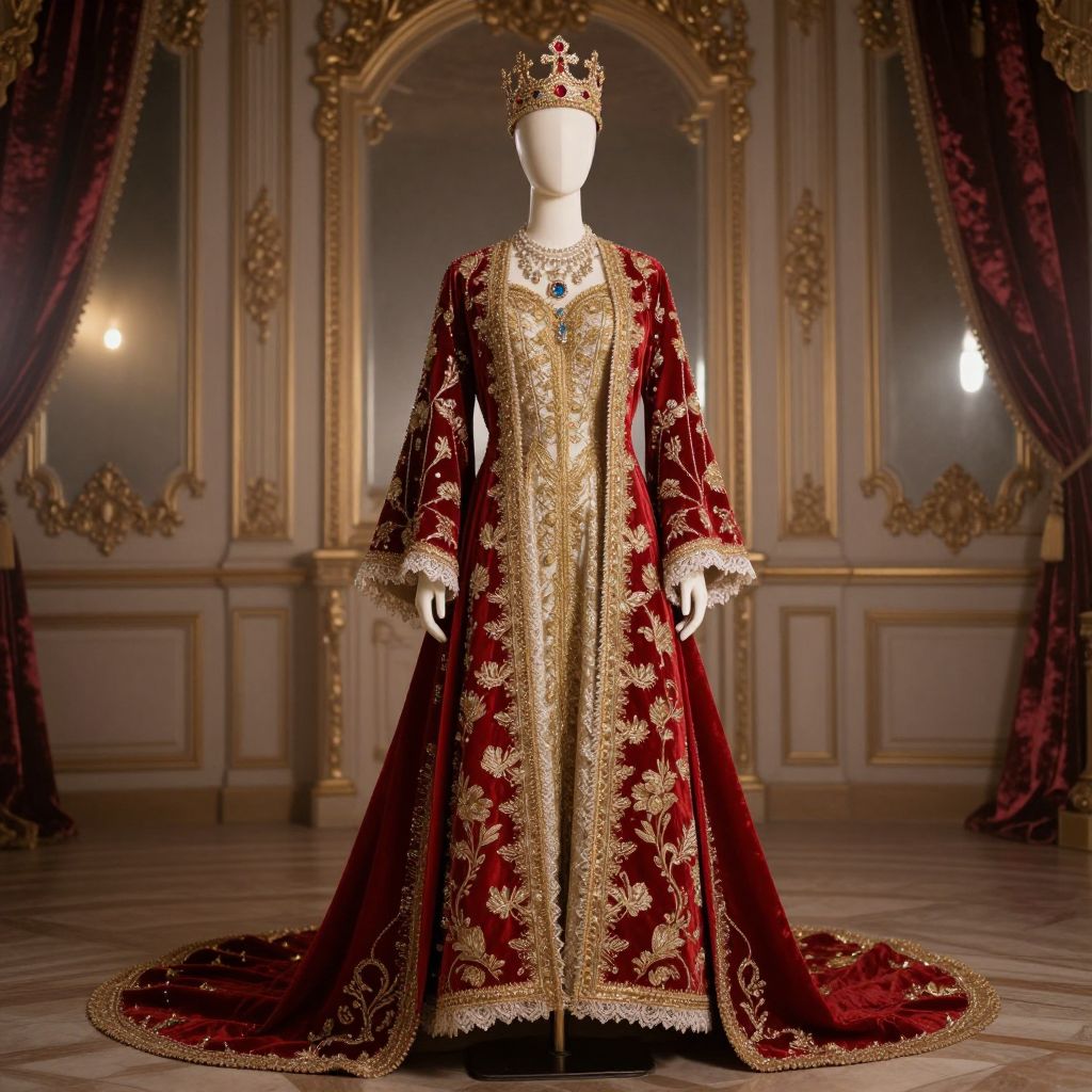 A mannequin dressed in an elaborate red and gold embroidered royal gown with intricate floral patterns and lace details. The outfit features flowing fabric with a long train, paired with a jeweled crown adorned with red and clear gemstones. Displayed in a luxurious, opulent room with gold-accented decor, velvet curtains, and soft, dramatic lighting that emphasizes the rich textures and regal design.