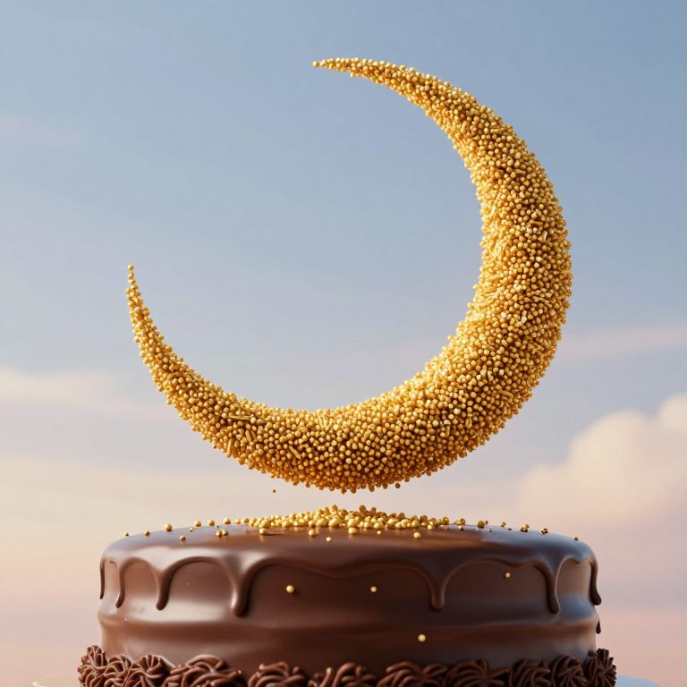 Photograph of a chocolate cake with a glossy, dark brown surface and decorative, dripping chocolate edges. Atop the cake, a large, golden crescent moon is composed of countless tiny, glittering particles. The background features a clear, blue sky with soft, white clouds. The crescent moon glows brightly, contrasting with the rich, dark chocolate of the cake. The image has a magical, whimsical feel, combining elements of food art and fantasy.