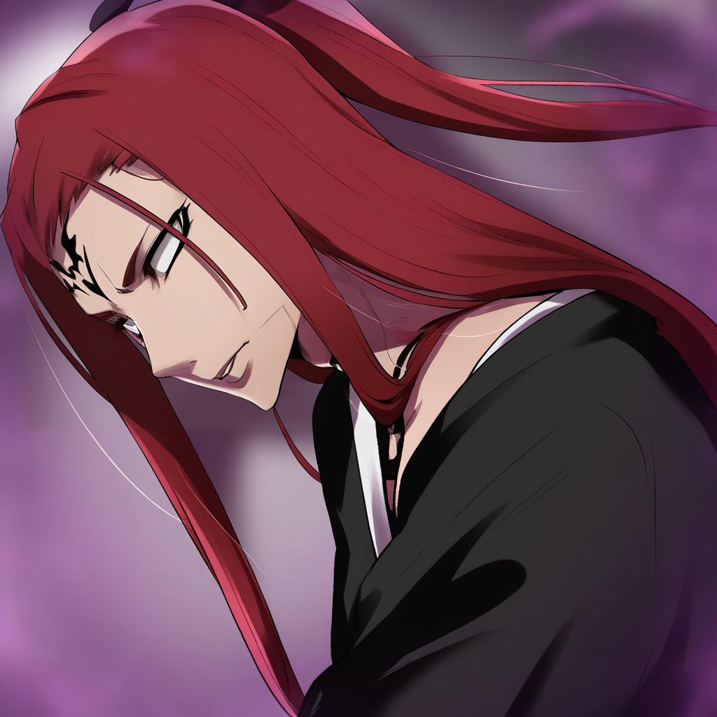 Abarai renji, bleach, 1boy, red hair, long hair, ponytail, chest tattoo, forehead tattoo, black kimono, by artist andou you, leet