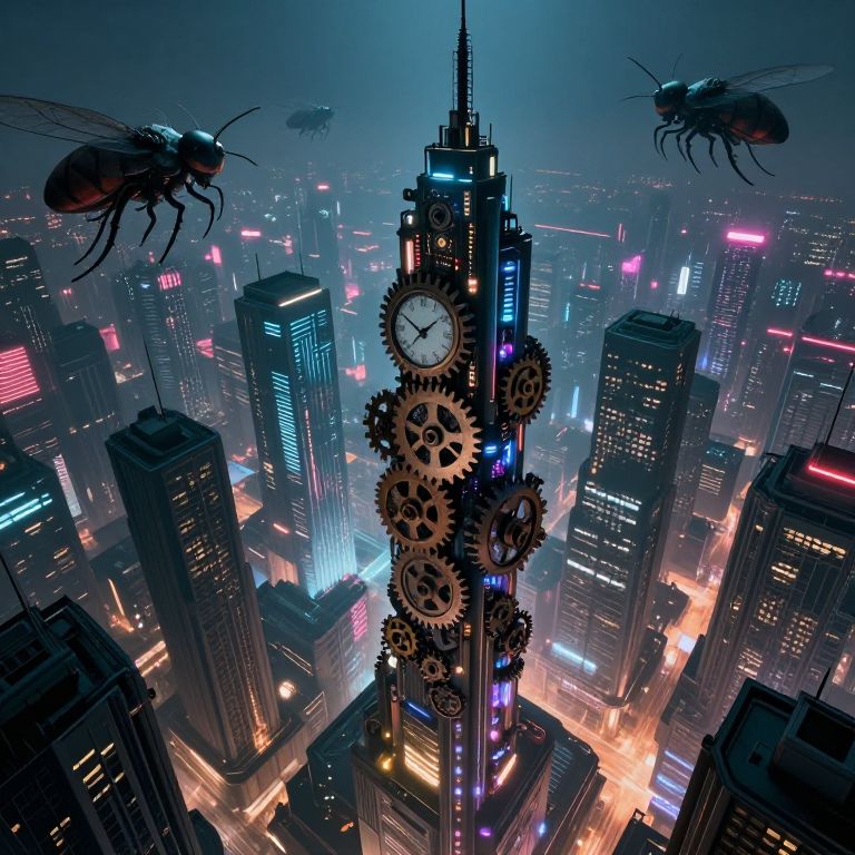 A surreal dreamscape featuring a futuristic cityscape born from the fusion of clock gears and metal structures, viewed from an unconventional angle looking upward at towering skyscrapers with faces reminiscent of clock faces, all moving in slow motion as if time is malleable. Neon lights illuminate the sky with vibrant shades of purple and blue, casting an enigmatic yet captivating ambiance over the urban landscape, evoking a blend of wonder, curiosity, and subtle unease as we are drawn into this perplexing world where technology and surrealism converge.