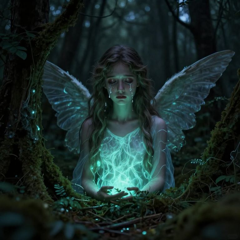 Digital fantasy art: ethereal fairy with glowing blue energy, translucent wings, long wavy hair, tears, in dark, mossy forest.