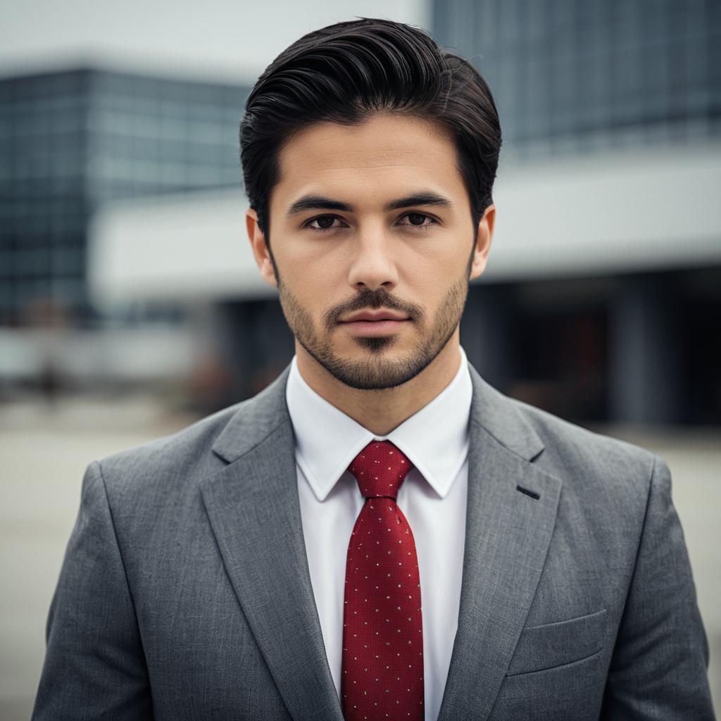 Wedding after party outfit,male focus, necktie, watch, 1boy, realistic, jacket, suit, shirt, white shirt, wristwatch, grey pants, pants, formal, grey jacket, facial hair, solo focus, looking at viewer, collared shirt, blurry, flower, white flower, blurry background, black necktie, short hair, indoors, long sleeves, standing, mustache