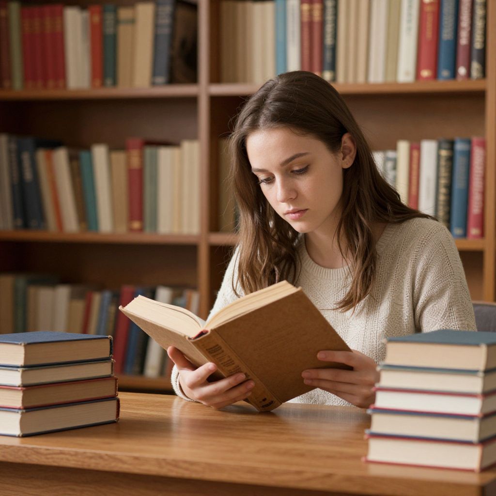 Focused young woman engrossed in reading a thick, aged book while seated at a wooden desk surrounded by neatly stacked volumes, with shelves of colorful books stretching behind her in a warmly lit library setting.
