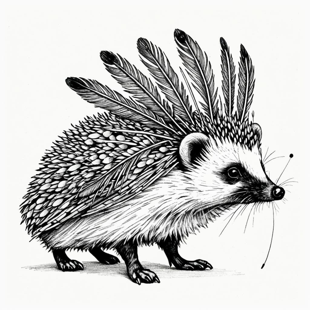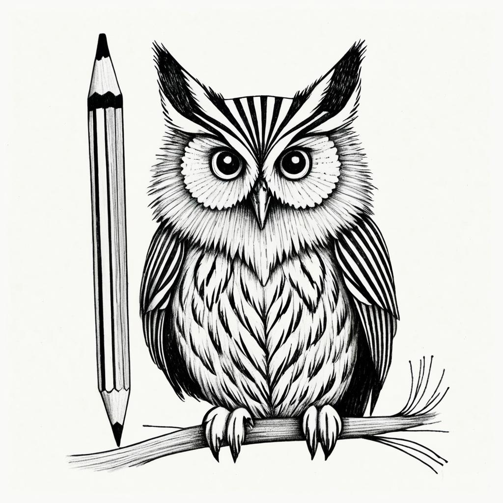 A whimsical pencil sketch of a owl with a fish tail, in a gentle and swirling hatching lines, minimalist and playful design, white background