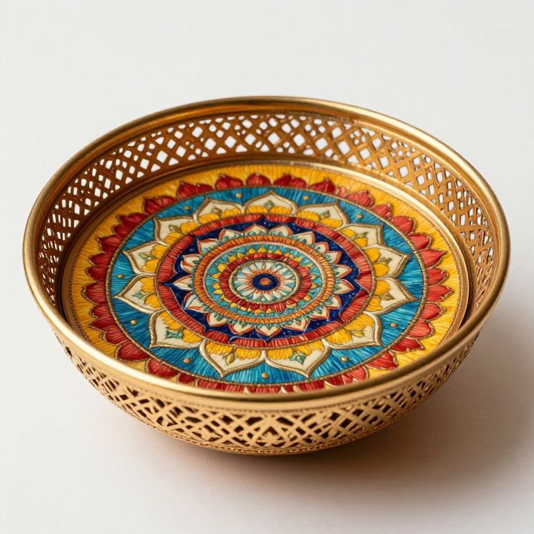 A Mughal-inspired snack serving bowl crafted with intricate gold filigree patterns and vibrant concentric mandala designs, showcasing traditional craftsmanship and ornate detailing in a high-definition, vintage aesthetic.
