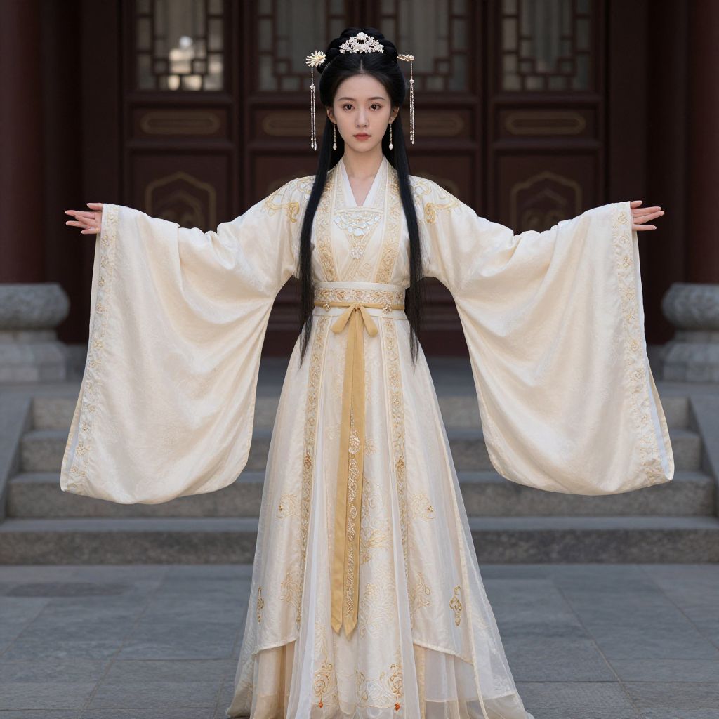 Asian queen costume, 1girl, solo, chinese clothes, black hair, realistic, standing, wide sleeves, hair ornament, dress, hanfu, earrings, jewelry, full body, long hair, long sleeves