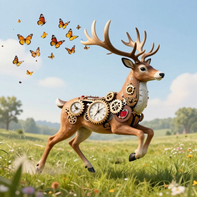 Digital artwork of a mechanical deer with gears, clock, and heart, running in a grassy field, with orange butterflies flying above.