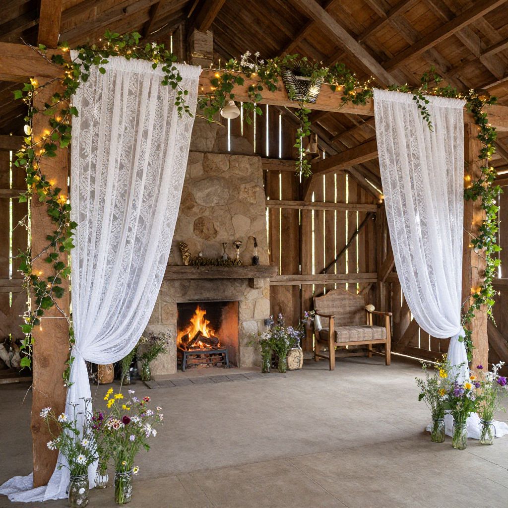 Background for wedding pictures showcasing a rustic barn decorated with white lace curtains, wooden beams wrapped in ivy and fairy lights, scattered wildflowers in mason jars, and a cozy fireplace, blending charm with countryside elegance