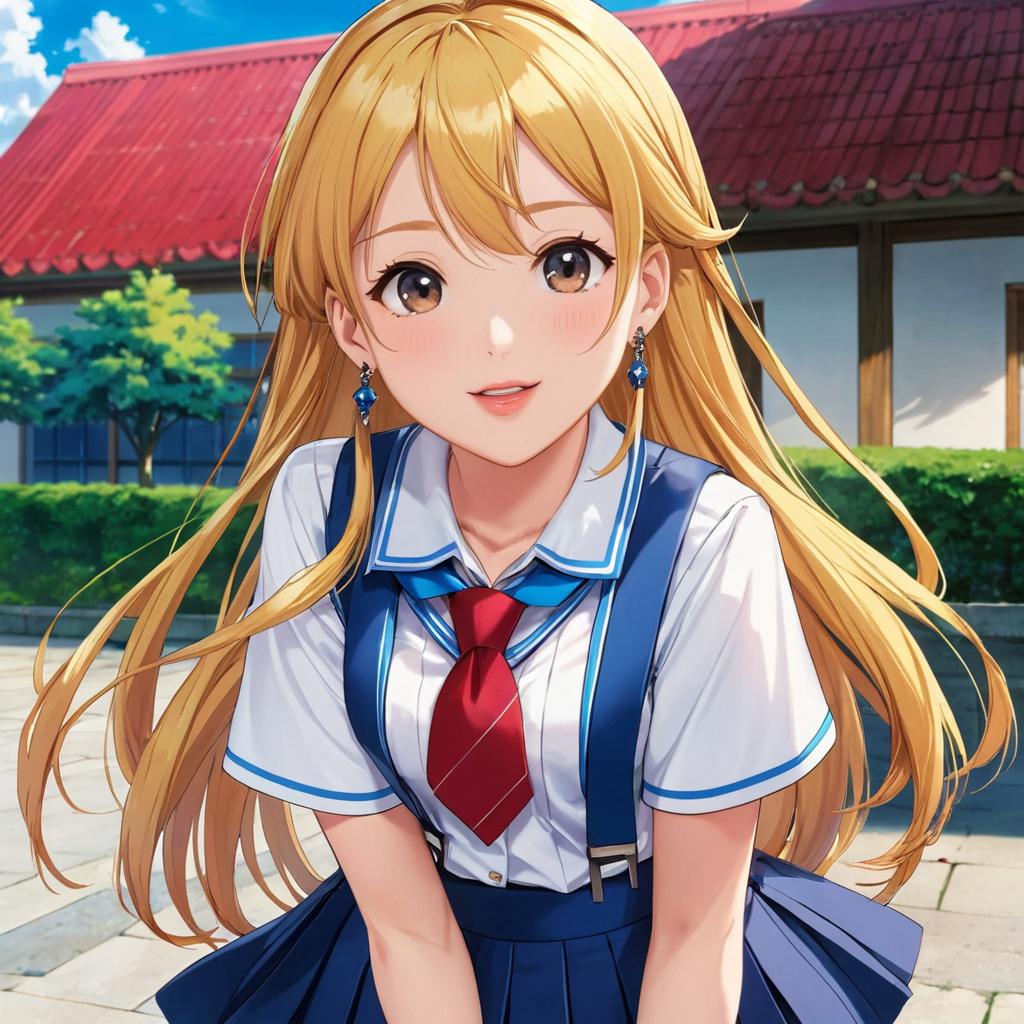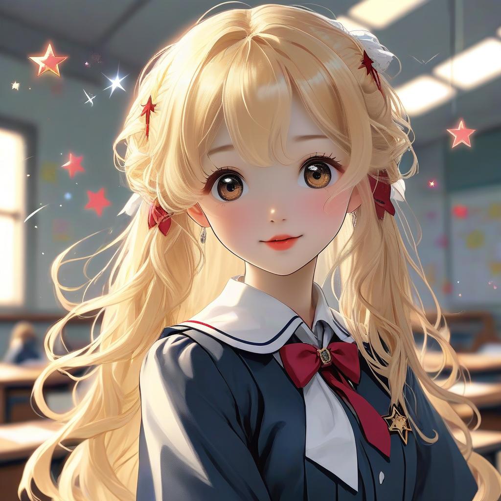 Masterpiece, best quality, ultra-detailed, illustration, 1girl, hoshino ruby, mismatched pupils, star-shaped pupils, blonde hair, long hair, school uniform, skirt, smile, looking at viewer, standing, upper body