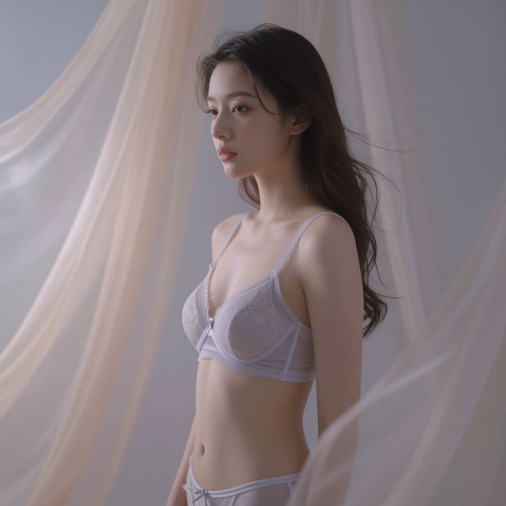 Photograph of an East Asian woman with long, wavy black hair, wearing a sheer, white lace bra and matching panties. Her skin is fair and smooth, and she has a slender, toned physique. She stands in a softly lit, ethereal setting with semi-transparent, white fabric draping around her. Her expression is calm and slightly introspective, with a subtle, natural makeup look. The background is a gradient of light gray to white, enhancing the delicate and dreamy atmosphere of the image. The lighting casts gentle shadows, emphasizing her delicate features and the texture of the lace fabric.