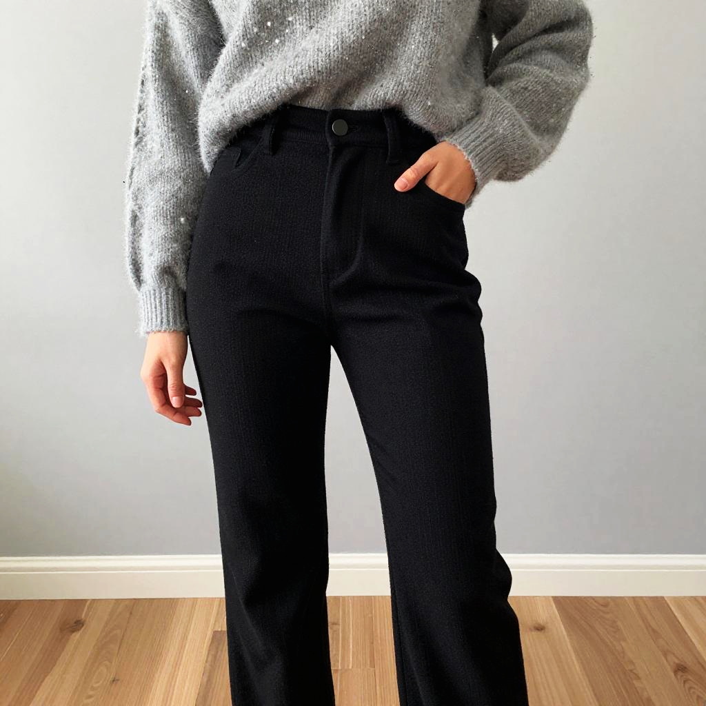 Photograph of a person's upper torso and neck, wearing a grey, ribbed, long-sleeved shirt with a pointed collar. A black seatbelt with small white reflective dots is securely fastened across their chest. The person's brown hair is partially visible, and they are seated in a dark car interior. The image is close-up, focusing on the seatbelt and shirt.