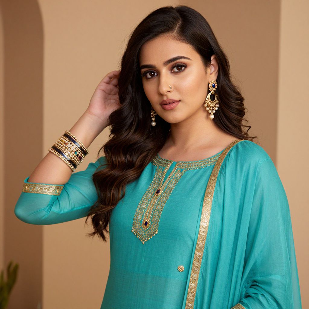 Photograph of a young woman with long, wavy black hair, wearing a turquoise salwar kameez with gold embroidery on the chest and sleeves. She has olive skin, brown eyes, and is adorned with gold jhumka earrings, a nose ring, and multiple gold bangles on her right wrist. She gazes directly at the camera with a neutral expression, her right hand gently touching her hair. The background is a simple, beige-colored wall, creating a subtle contrast with her vibrant outfit. The image has a soft, warm lighting that highlights her features and the textures of her clothing.