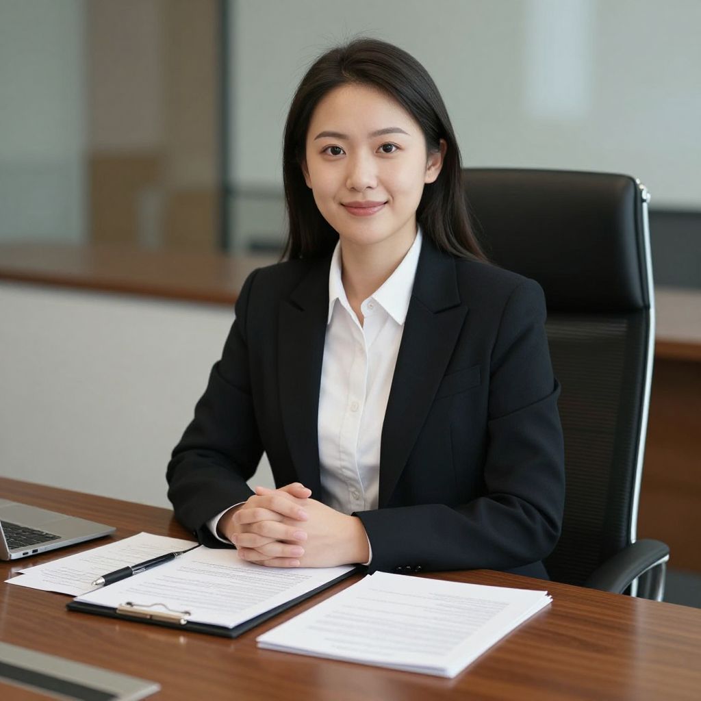 Professional businesswoman seated at a conference table, dressed in a crisp white shirt and tailored black blazer, smiles warmly at the camera with her hands clasped together, surrounded by documents and a pen, exuding confidence in a modern office setting.
