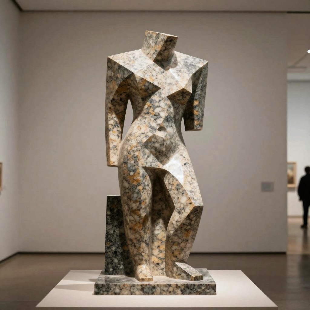 Modern art scolpito abstract figure, featuring sharp geometric edges and smooth curves mingled harmoniously, polished granite surface reflecting ambient light, set inside a minimalist museum space with neutral tones.