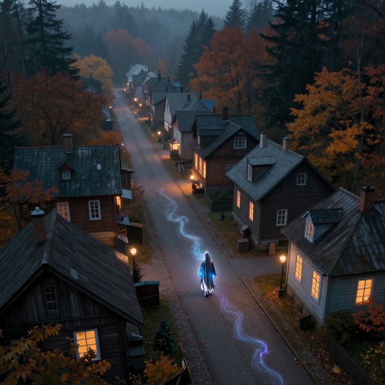 A mesmerizing digital artwork portraying an enchanting autumn evening in a quaint small town nestled among dense forests. From a captivating aerial perspective, observe the tranquil main street lined with charming cottages and rustic wooden houses, their warm lights emanating a comforting glow through foggy windows. Amidst this idyllic scene, a mysterious figure draped in shimmering silver-blue fabric silently traverses the streets, leaving ephemeral trails of iridescent smoke - remnants of otherworldly encounters. This enigmatic wanderer exudes an aura of melancholic nostalgia as they vanish into the shadows of the surrounding woods, stirring a sense of longing and curiosity about their origins and purpose in this seemingly perfect world. The artwork masterfully captures the essence of nostalgia while subtly weaving elements of mystery and magic into the scene.