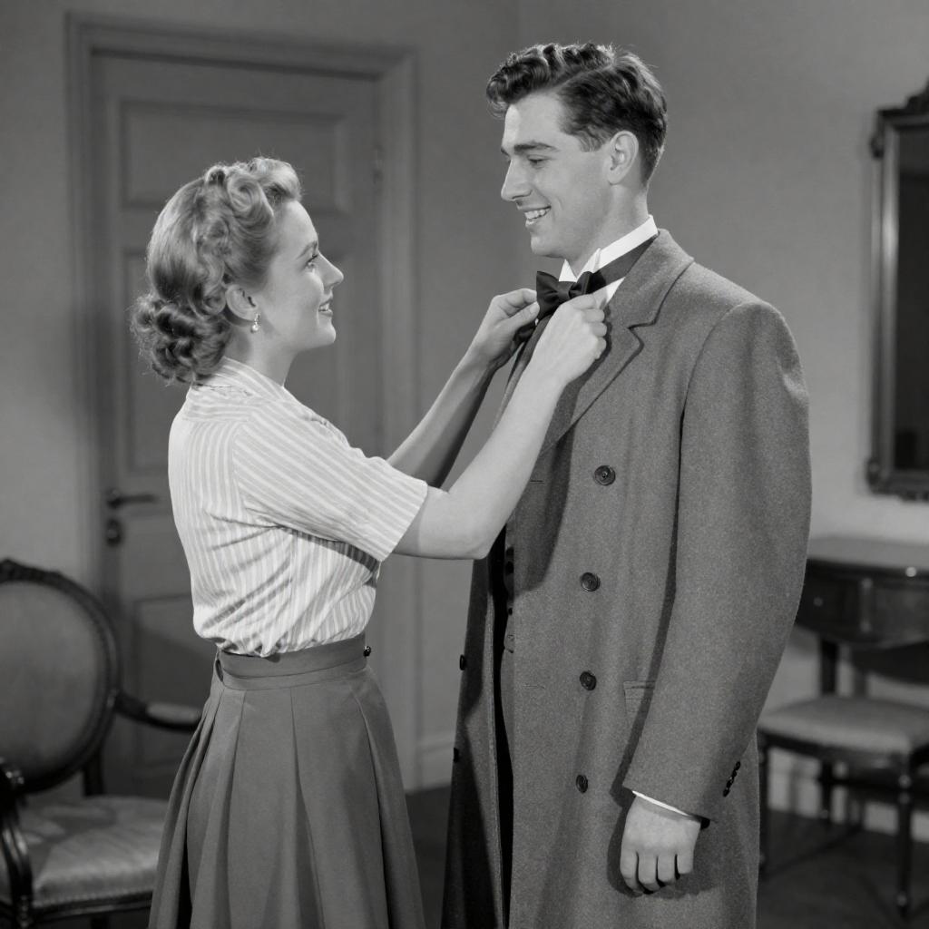 Black-and-white photograph of a 1940s-style scene. A smiling young man with short hair wears a buttoned coat and tie, standing as a woman with blonde hair in a bun adjusts his bow tie. She wears a striped blouse and high-waisted skirt. They are in a well-lit, elegant room with a wooden door and a chair in the background.