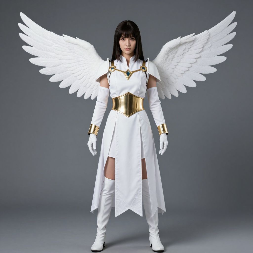 Photograph of a woman in a white angel costume with large, white, feathered wings. She has straight, black hair with bangs and wears a white, long, sleeveless dress with gold accents, including a wide gold belt and arm cuffs. She also wears white, thigh-high boots and white gloves. Her expression is neutral, and she stands against a plain, gray background. The costume has a sleek, futuristic design, and the wings are prominently displayed, extending outward. The overall look is elegant and otherworldly.