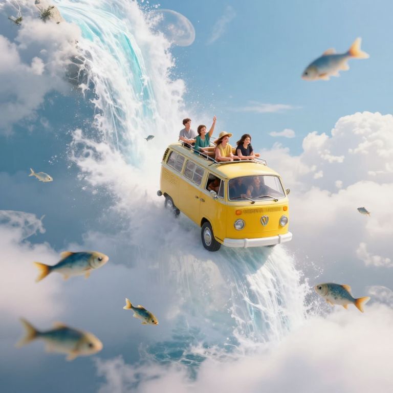 An ethereal ascent of dreams and whimsy, where a vibrant yellow van carries passengers toward the heavens on a cascading waterfall of hope, while airborne fish glide through the soft embrace of clouds, evoking a surreal blend of wonder and transcendence.