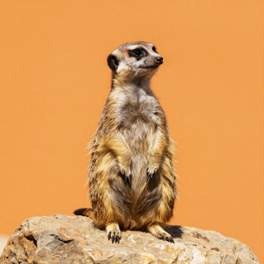 Photograph of a meerkat standing on a rock against a bright orange background, showcasing its brown and black fur, black eyes, and upright posture