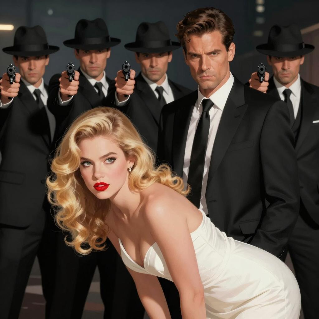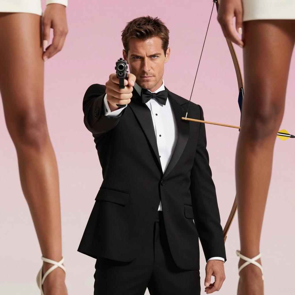 Man in black tuxedo with white shirt and black bow tie, pointing gun forward, background pink gradient sky. Two legs in foreground, dark skin, wearing white straps around ankles. Bow and arrow on right. Man's face intense, eyes focused. Two people total.