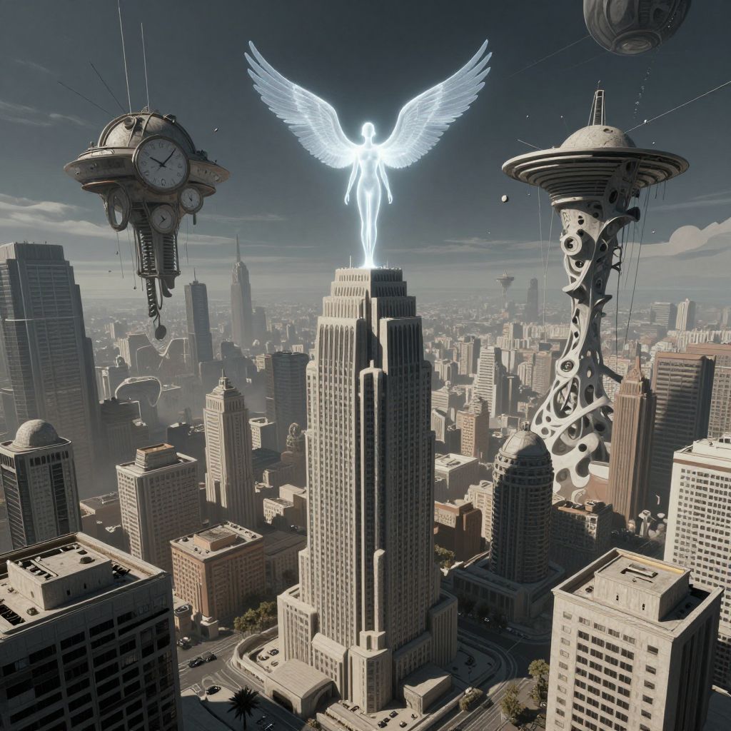 Digital art of a futuristic cityscape with a glowing angel with wings emerging from a skyscraper, surrounded by floating UFOs and a giraffe-shaped structure