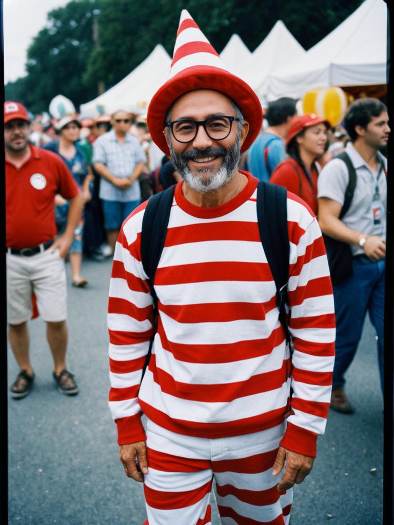 Man in Waldo costume, candid festival portrait, photorealistic realism