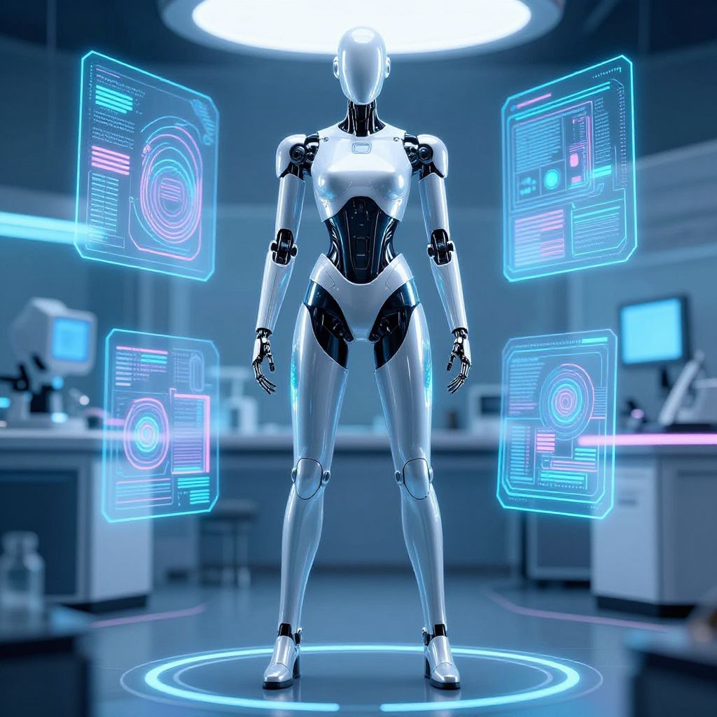 Digital CGI of a glowing, blue-lit, wireframe female humanoid figure in a futuristic lab, surrounded by holographic data screens.