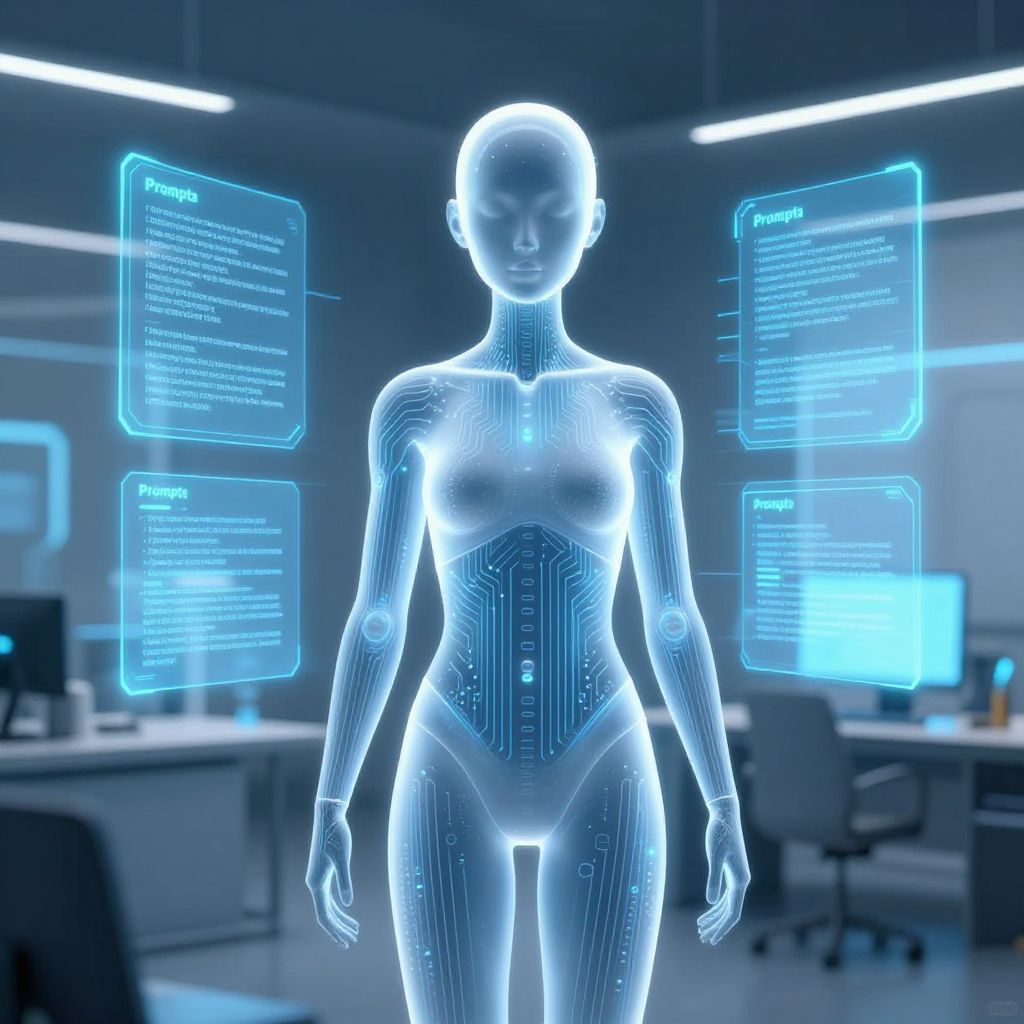 Illustration of Prompta as a humanoid AI with translucent skin displaying circuit patterns, surrounded by holographic screens filled with knowledge and information, set in a futuristic workspace with sleek technology and minimalist design.