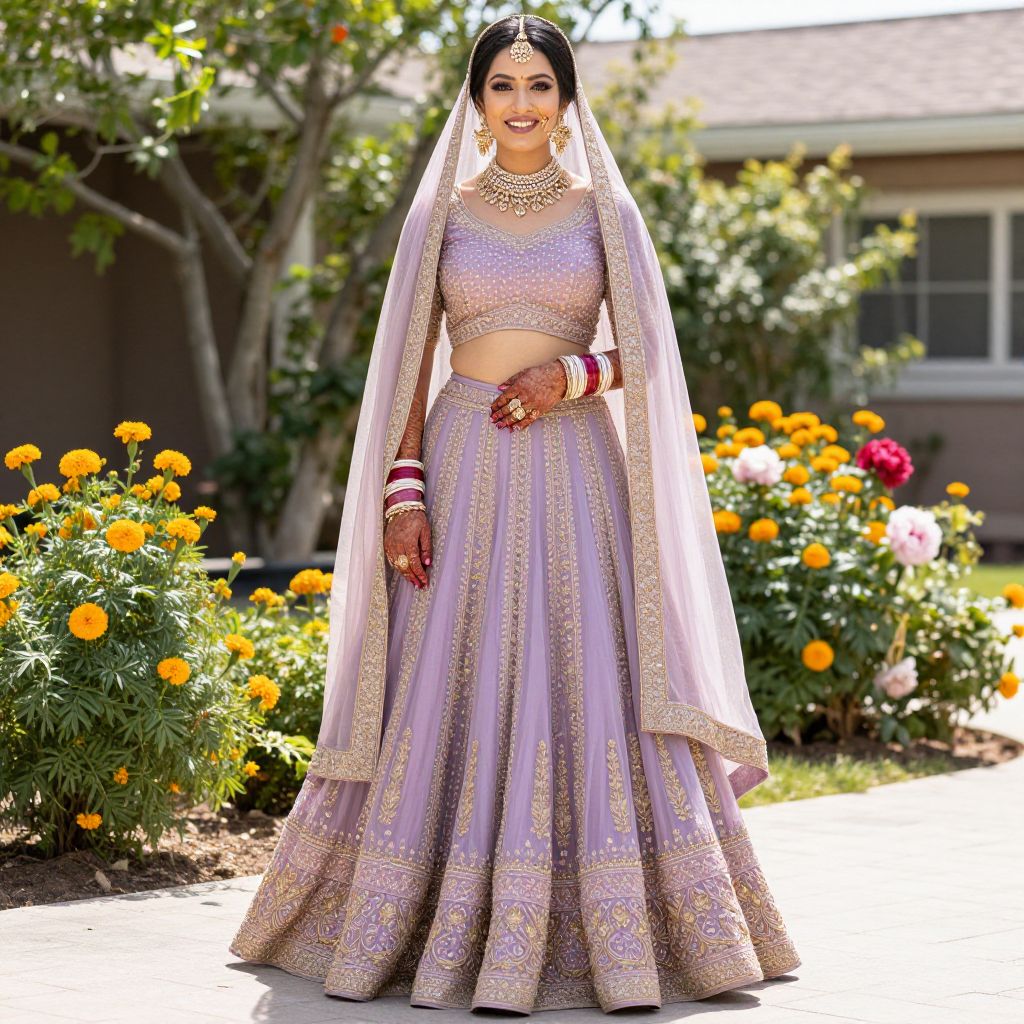 A stunning Indian bride wearing a pastel lehenga bridal costume, with a soft lavender hue, flowing silk fabric, and delicate gold embroidery, standing in a sunny suburban wedding garden with blooming marigolds and peonies in the background, her face radiant with joy and traditional bridal makeup, smiling gently at the camera.