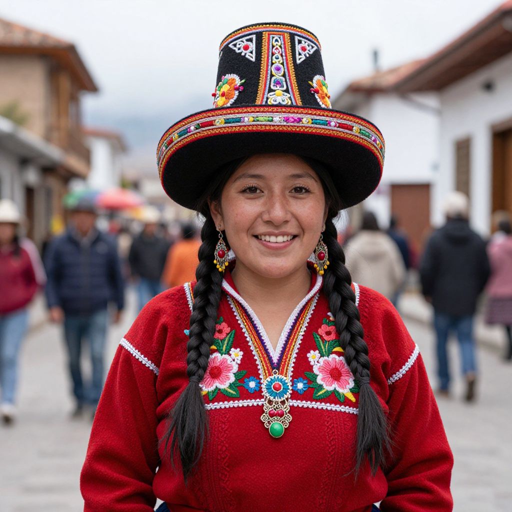 Smiling Peruvian woman wearing a tall, intricately decorated black hat adorned with vibrant red and gold trim, paired with a richly embroidered red blouse featuring floral patterns and complemented by braided hair and colorful jewelry, stands confidently in a bustling street setting.