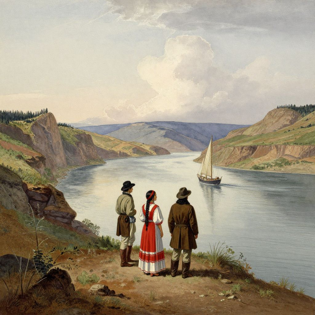 The image depicts a detailed watercolor painting of the Columbia River Gorge, viewed from a distance. Three figures stand on the river's edge, one of whom is a Native American woman dressed in a vibrant red and white dress with a red headband. Accompanying her are two frontiersmen, one wearing a brown coat and the other in a lighter-colored outfit. The figures are positioned near the center of the composition, with the woman slightly to the left. In the background, a sailboat is seen on the river, aligned with the figures and adding depth to the scene. The landscape features rolling hills and mountains, with a prominent rocky outcrop to the left. The sky is a soft, cloudy gray, and the overall color palette is muted with earthy tones, creating a serene and nostalgic atmosphere. The painting captures the essence of the Columbia River Gorge, blending natural beauty with the presence of early explorers and settlers.