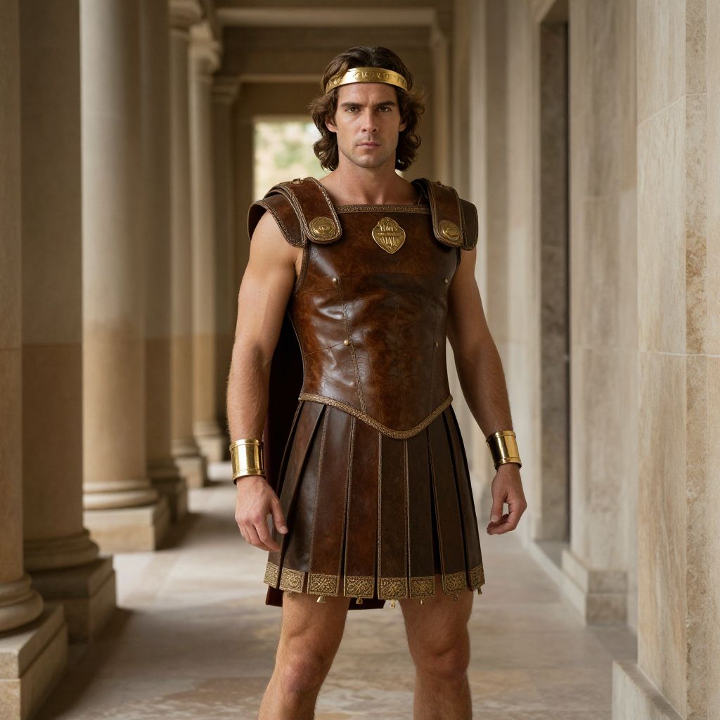 Ancient greek god costume, a man in a roman costume standing in a hallway