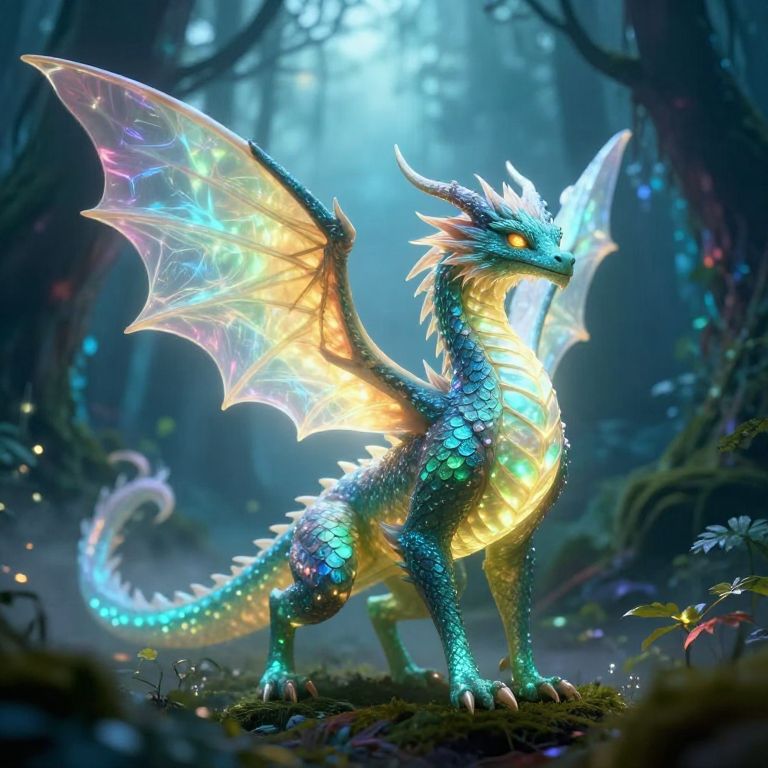 Mythical creature randomizer, a surreal blend of ancient dragon and forest nymph, glowing ethereal wings, bioluminescent scales, misty enchanted forest background, vibrant colors, fantasy art style, highly detailed, cinematic lighting