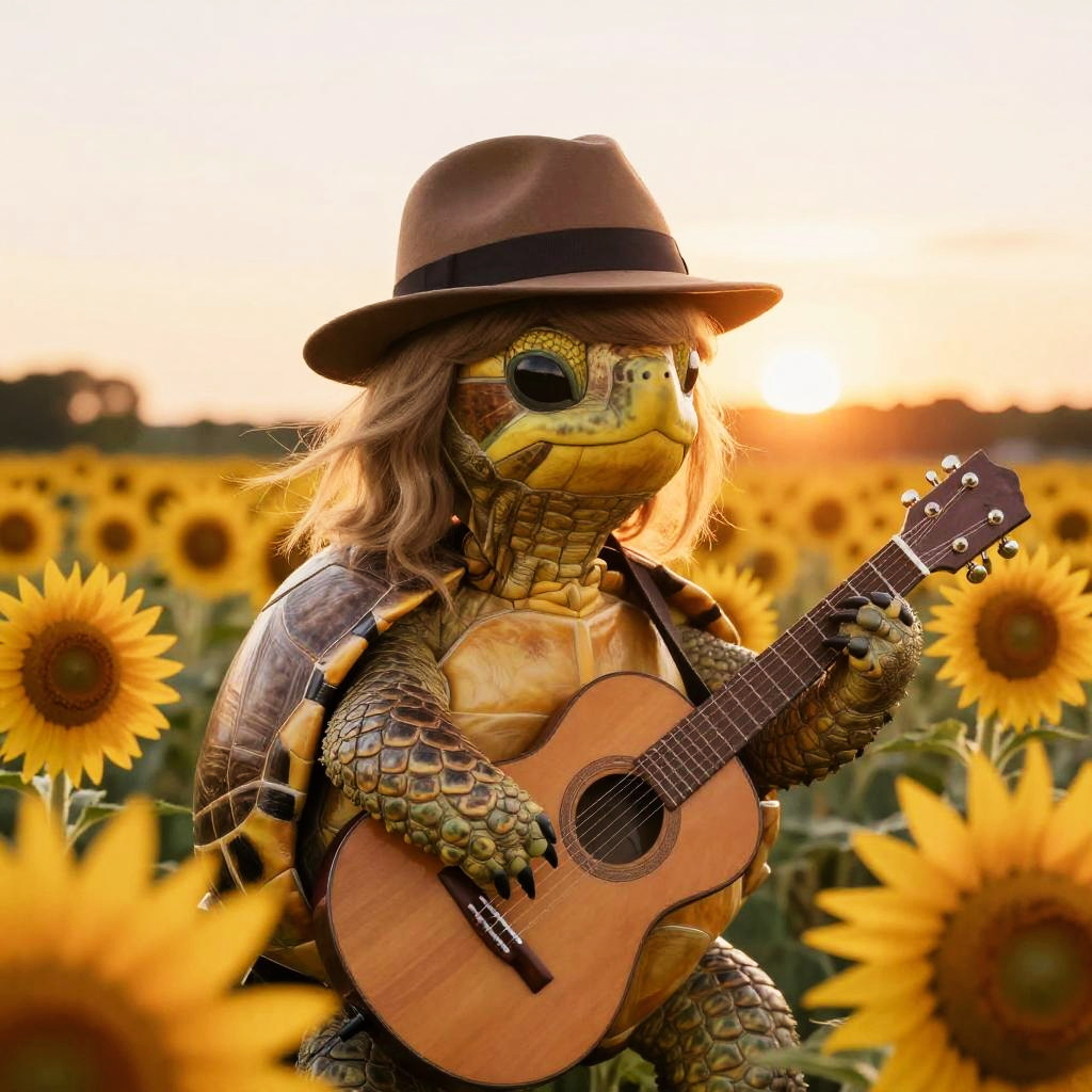 Taylor Swift turtle, a turtle in a stylish fedora and guitar on a sunflower field at sunset, with a gentle breeze, detailed textures and warm golden hues