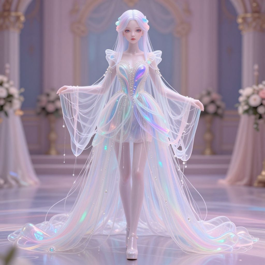 A digital CGI image of a fair-skinned, slender young woman with long, white, flowing hair, wearing an ethereal, iridescent white gown with intricate beadwork and a long, translucent veil that drapes to the floor. She stands in a grand, ornate room with arched windows and purple-blue walls, adorned with gold trim and floral arrangements. Her gown features puffed shoulders and a fitted bodice, and she wears white high-heeled shoes. The image has a glowing, magical aesthetic with soft, pastel colors and a dreamy atmosphere.
