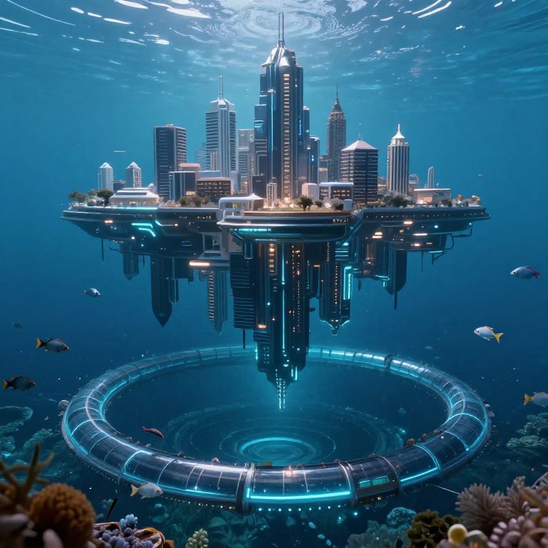 Photorealistic CGI: Futuristic underwater city with illuminated skyscrapers floating above a circular, glowing base, surrounded by coral reefs and fish.