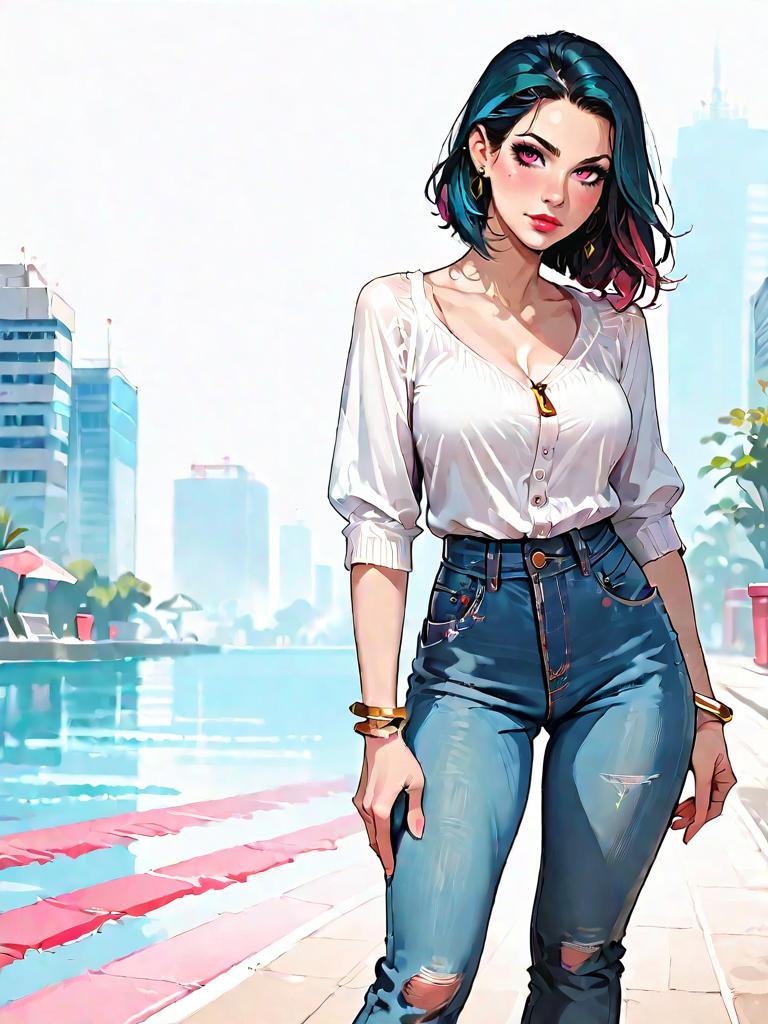 1girl, source_comics, realistic face, full body shot, Woman, business casual, solid teal v-neck blouse with a zipper detail, three-quarter length roll-tab sleeves, tucked into dark denim skinny jeans, gold bangle bracelets.
