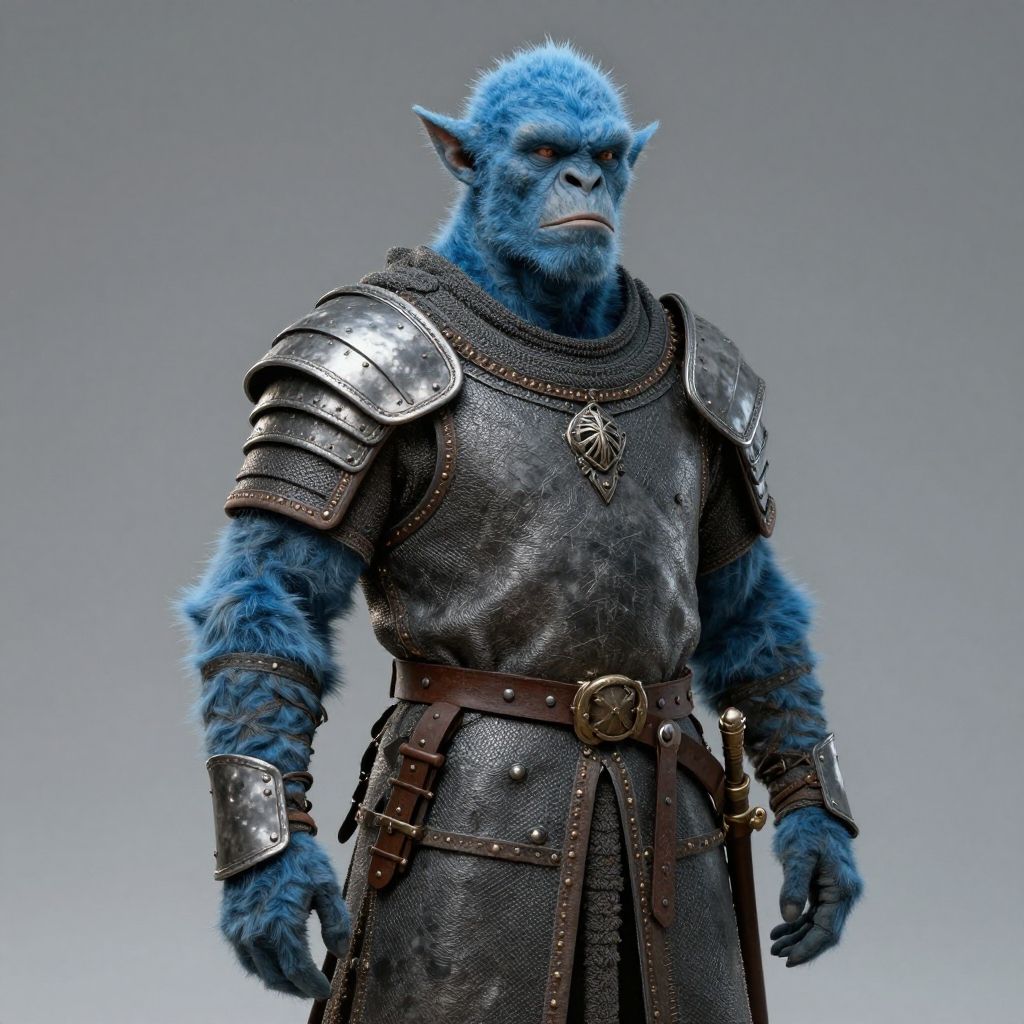CGI image of a blue-furred, muscular orc warrior with pointed ears, wearing metal armor, leather tunic, and belt, standing against a