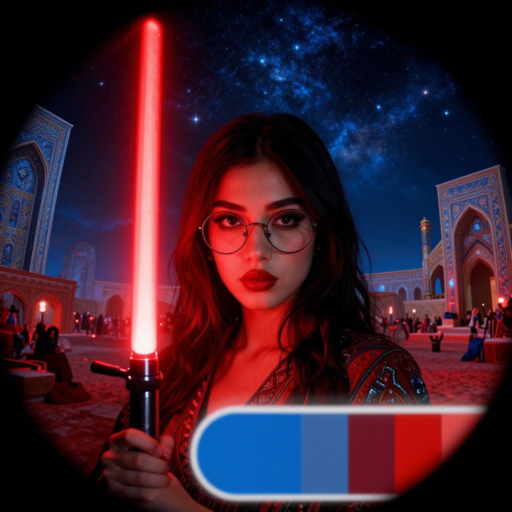 Photograph with digital effects: A young woman with long, dark wavy hair and wearing round glasses, red lipstick, and a shiny, patterned top holds a glowing red lightsaber in a historic, night-time square. The background features illuminated, ornate domes and arches, and a starry sky. Bright red and blue overlay bars are in the foreground, adding a VR-like effect. The woman's red lightsaber contrasts with the blue and red bars, creating a futuristic, sci-fi ambiance. People are visible in the background, adding depth to the scene.