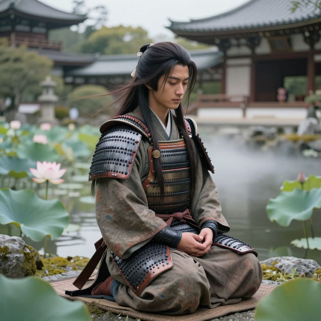 A digital painting depicts a young Asian man with long black hair in a traditional samurai outfit, seated cross-legged by a serene pond. He wears detailed black and brown armor with gold accents and a brown kimono. His expression is calm and focused. The background features traditional Japanese architecture with curved roofs and lush greenery. Large lily pads and a pink lotus flower float in the pond, which is partially obscured by mist. The overall scene is tranquil, with soft lighting highlighting the subject's serene presence.