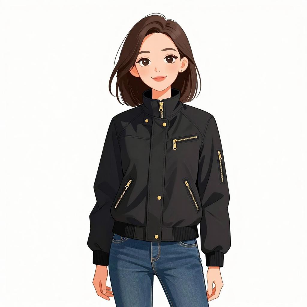 Woman with pretty face and pretty hair. smiling Woman, casual, black parka jacket with high collar, zipper and snap button closure, four front pockets with golden zip accents, ribbed cuffs, denim jeans, slim fit. --sref 1467