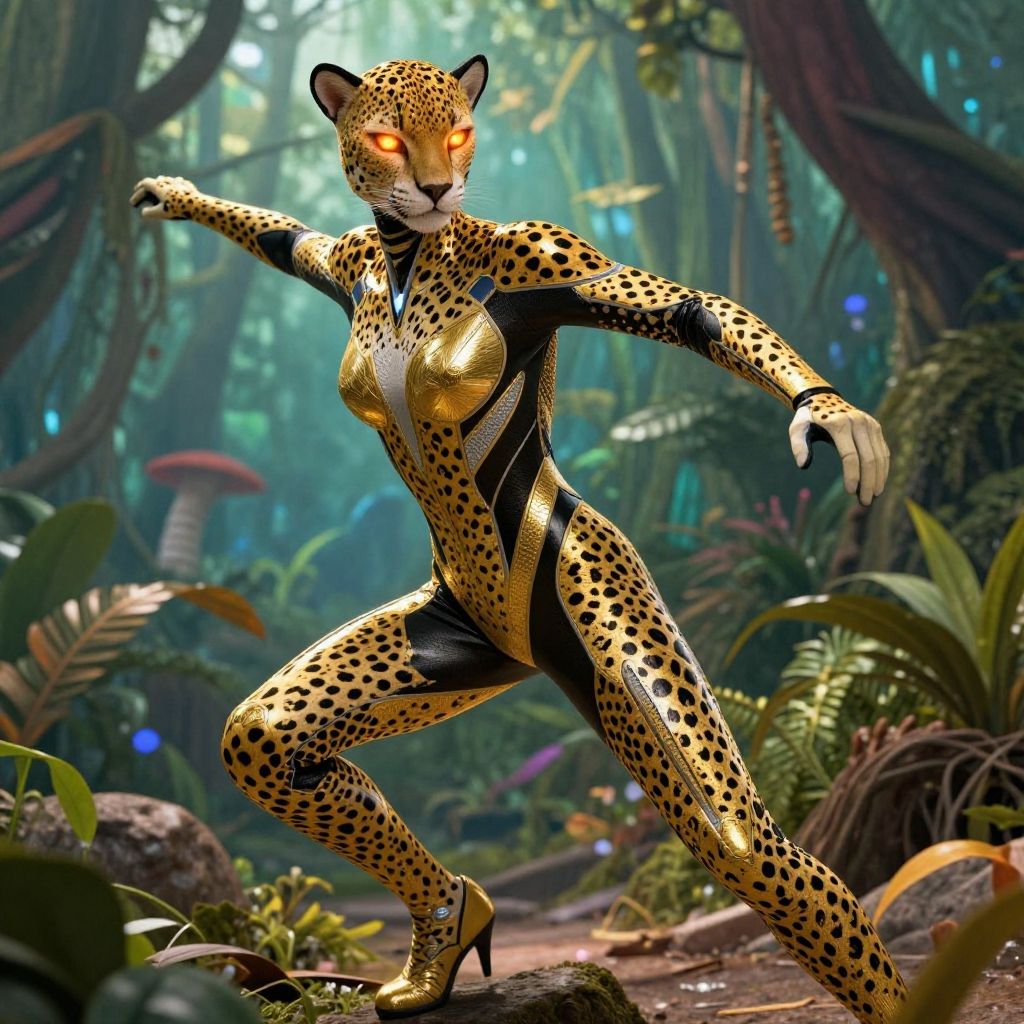Cheetara costume design, sleek and futuristic bodysuit with golden cheetah spots, dynamic and agile pose, glowing orange eyes, fantasy jungle background, vibrant and detailed, high contrast lighting, comic book style art.