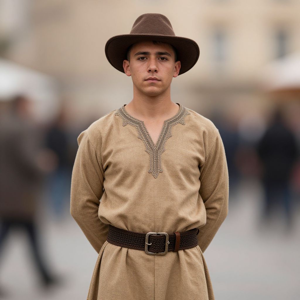 Male gypsy costume fancy, 1boy, male focus, solo, hat, looking at viewer, arms behind back, standing, blurry background, closed mouth, belt, realistic, blurry