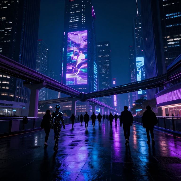 Neon-lit, futuristic cityscape photograph of a busy pedestrian bridge at night, with silhouetted people, vibrant purple and blue lights reflecting